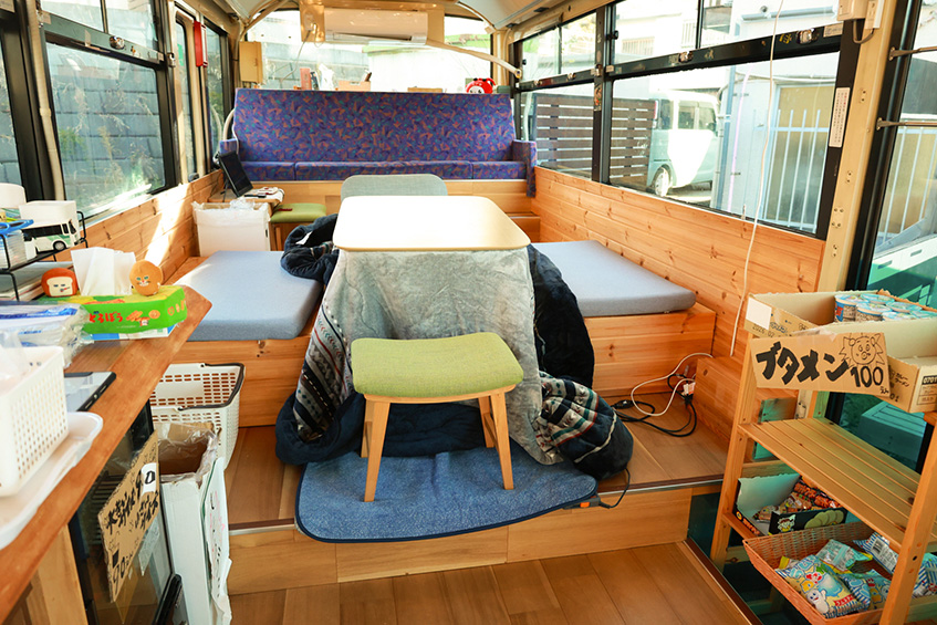 ーー中はバスだった時の様子を残しつつ、思わぬ形にリフォームされているのですね。コタツがあるなんて不思議な光景です。